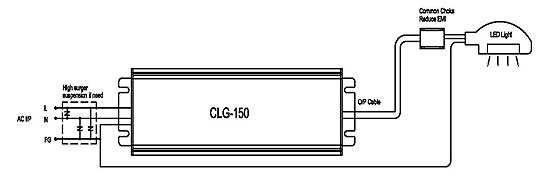EMI測試采用電源與LED負載分離測試并出具EMC報告(EN55015/EN55022),如具有FG接地機型遇有EMI問題,建議可先試著將電源本體及LED燈體皆與FG連接,可降低整體EMI噪聲干擾,另外由于輸入及輸出線長依據(jù)客戶應(yīng)用可能長達數(shù)米,其共模噪聲將非常大,建議于靠近LED燈體端加上共模夾扣鐵心可有效降低此噪聲,AC如線長亦可采此方式對策(如圖8)。
