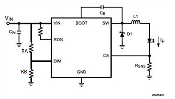 DIM PIN 為PWM調(diào)光控制PIN也有標示為為EN (Enable),DIM(or Enable)保持0V時內(nèi)部SW為關(guān)斷; DIM之電壓達到1.5V(Typ)時則Turn ON。因此設(shè)定DRIVER的啟動電壓Vstart,Vstart = (VDIM/RB) x (RA+RB),Vstart設(shè)定以高出 LED的工作電壓5~10%為原則。