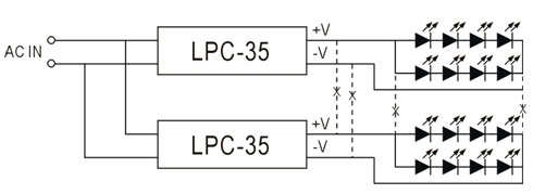 明緯LED power supply并無并聯(lián)功能,不可做并聯(lián)使用,如有大瓦數(shù)需求,建議選擇足夠瓦數(shù)的電源供應(yīng)器或?qū)ED分割成幾個區(qū)塊各別供應(yīng)電源,LED布局上也要依圖(5)所示,將各別電源供應(yīng)器的輸出地回路分開。相反地,小瓦數(shù)的LED燈串則可并接后再由一較大額定的LED電源供應(yīng)器來驅(qū)動(如圖5所示),但須考慮其均流性。