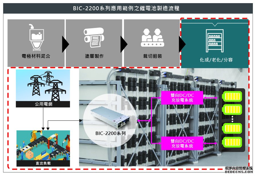 如下圖所示,電池生產(chǎn),從電極制作開始一直到出貨期間,部分制程需透過電池的充放電,以確保電池的功能與效能。所有制程中,以「化成」與「老化&分容」這兩大制程耗能最巨,其中「化成」更是影響電池質(zhì)量的關鍵制程之一。在過去,電池生產(chǎn)線需采用一臺充電器搭配一臺逆變器,方能實現(xiàn)「化成」與「分容」兩個制程。此作法不僅占據(jù)較大的空間,整體成本也無法有效下降;越多原件也意味著維護成本升高,信賴度大幅降低。